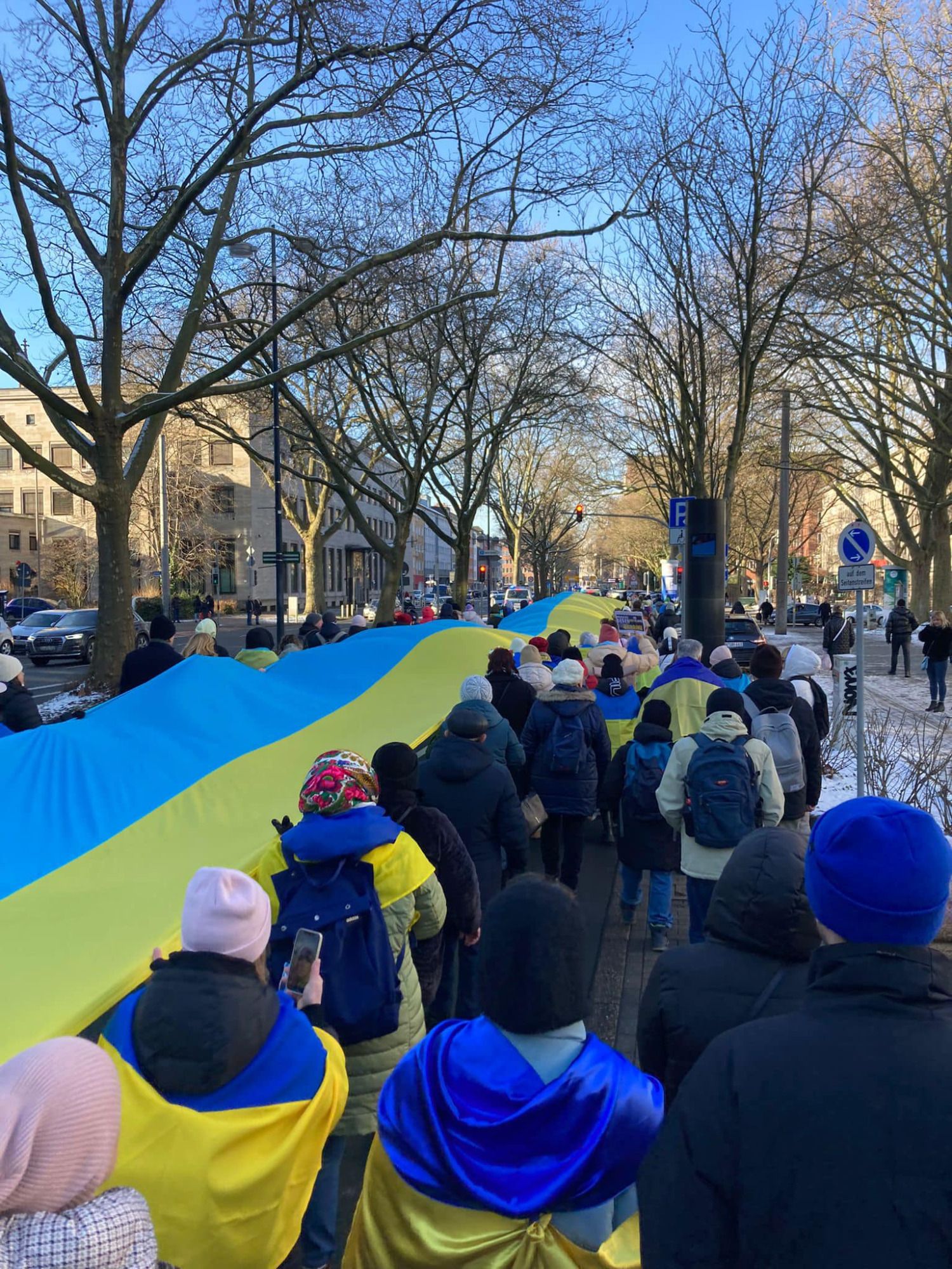Zuerst waren wir auf dem von der Initiative Ukrainer in Deutschland Українці Дортмунда - Blau-Gelbes Herz organisierten Demomarsch ausgehend vom Friedensplatz in Dortmund. Dabei halfen wir eine 100 m lange Flagge über den Wall um die Dortmunder Innenstadt zu tragen. Ziemlich beeindruckende Aktion!