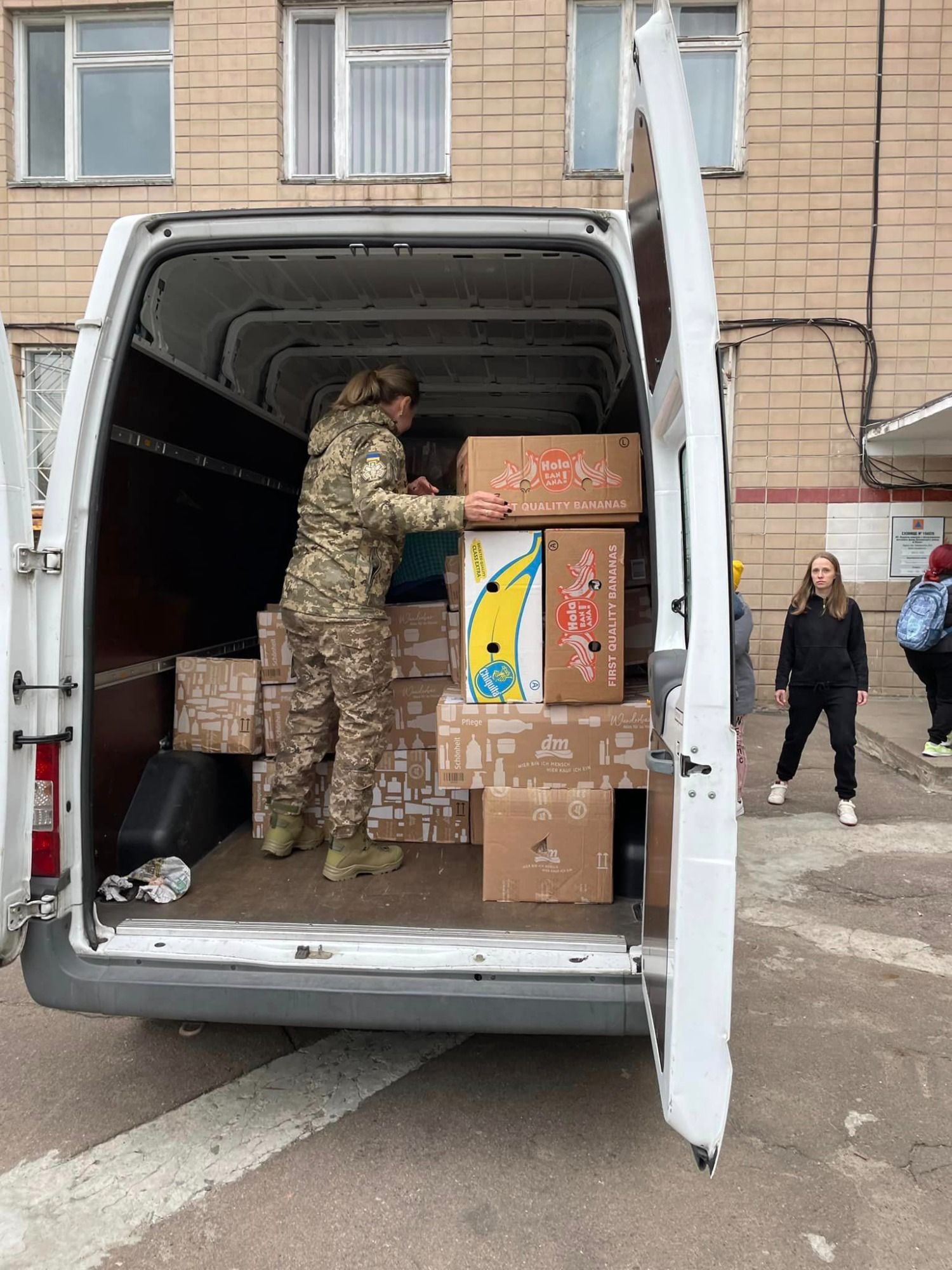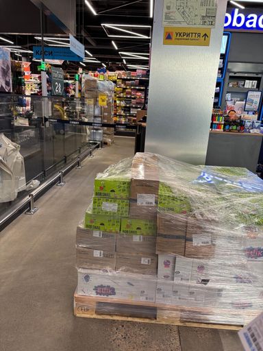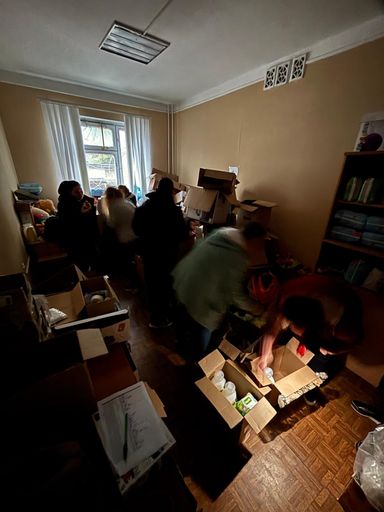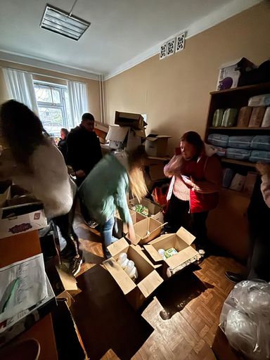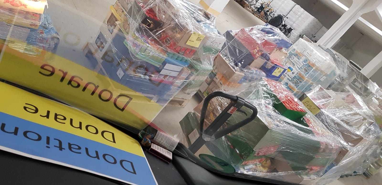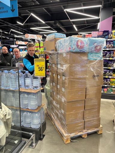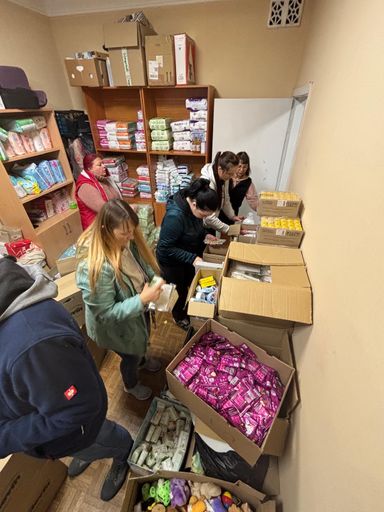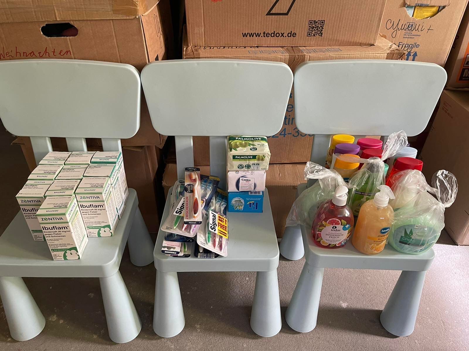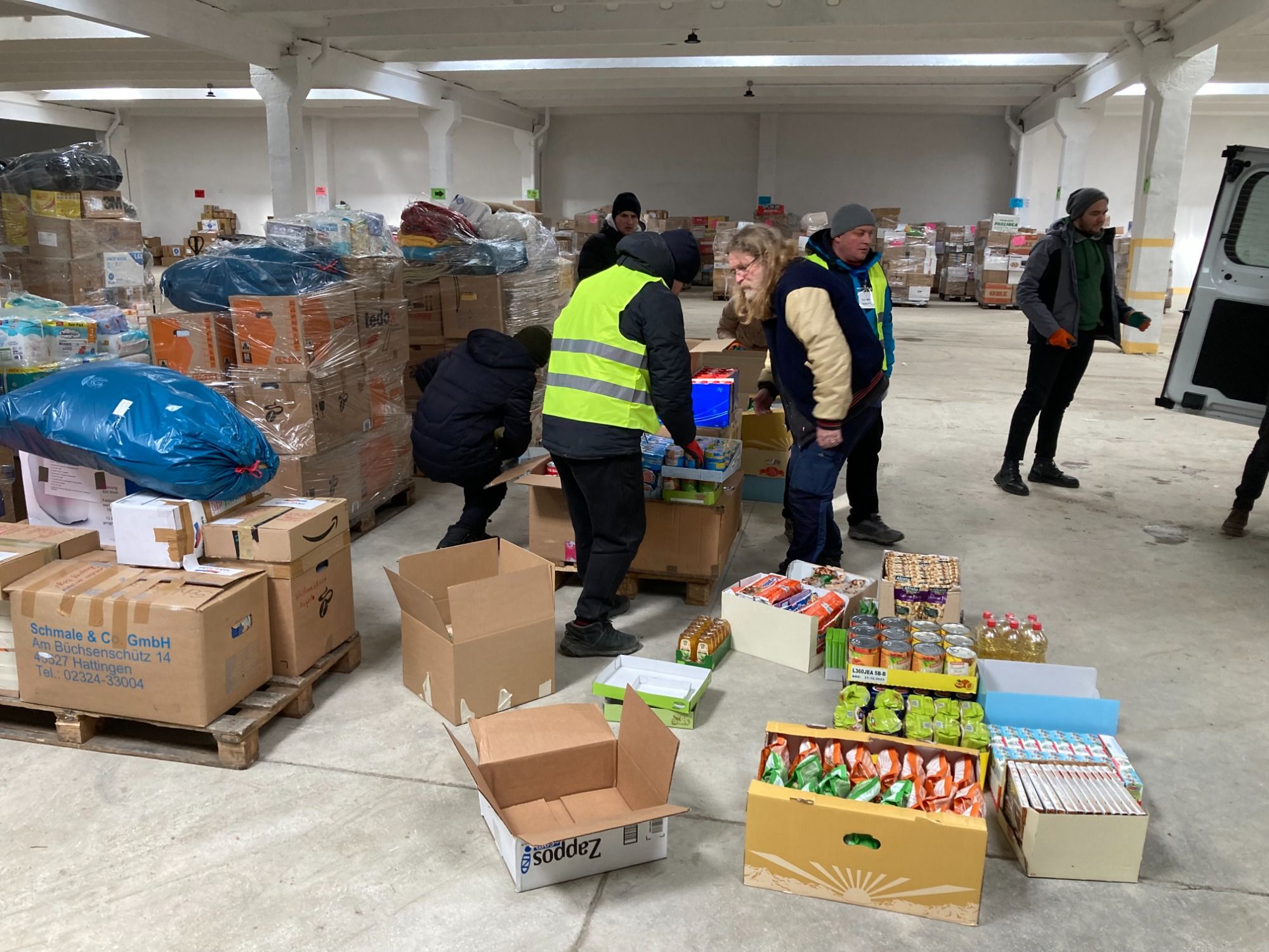 Touchdown in Kiew. Die Spenden werden nun von den Helfenden in Päckchen für die Übergabe sortiert während unsere Vereinsmitglieder von den übrigen Spendengelder zusätzliche Einkäufe tätigen.